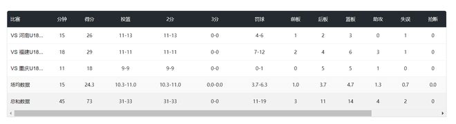 对阵重庆U18,15分钟9中9,罚球1中0,拿到18分5篮板1助攻1盖帽,命中率100%。