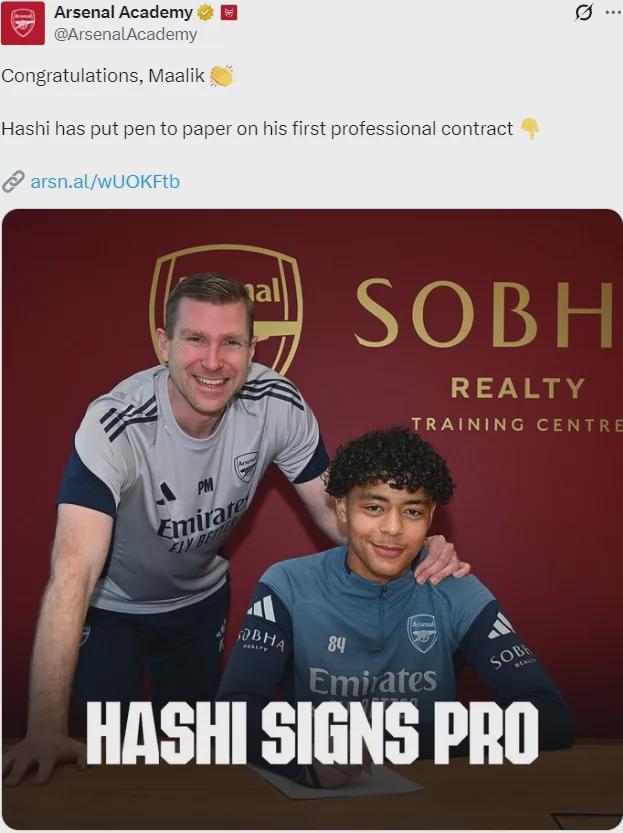 官方:阿森纳宣布马利克-哈希签下了他的第一份职业合同。