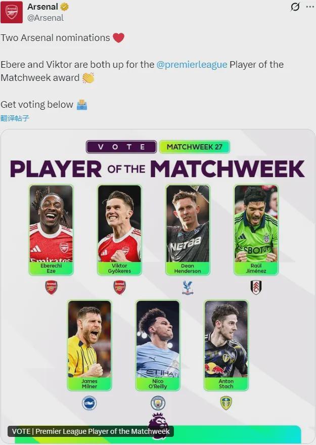 官方:埃泽和哲凯赖什都被提名为了英超上周最佳球员候选。