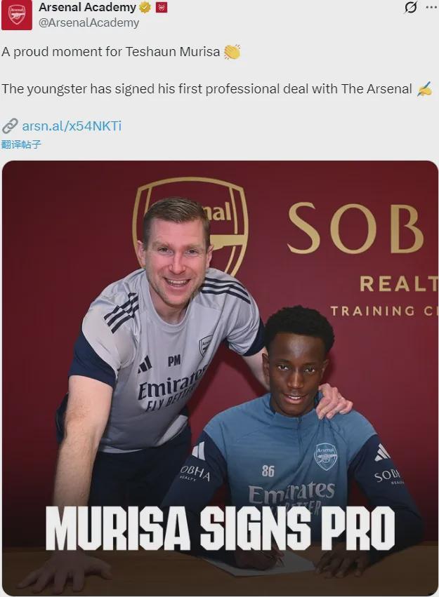 官方:阿森纳宣布和特尚-穆里萨签下了他的首份职业合同。